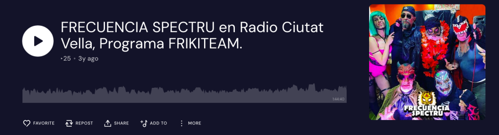DISPARATADA ENTREVISTA A FRECUENCIA SPECTRU EN EL PROGRAMA FRIKITEAM DE RADIO CIUTAT VELLA DE BARCELONA ☛ Compártelo: Haz clic para compartir en X (Se abre en una ventana nueva) X Haz clic para compartir en Facebook (Se abre en una ventana nueva) Facebook Me gusta Cargando...